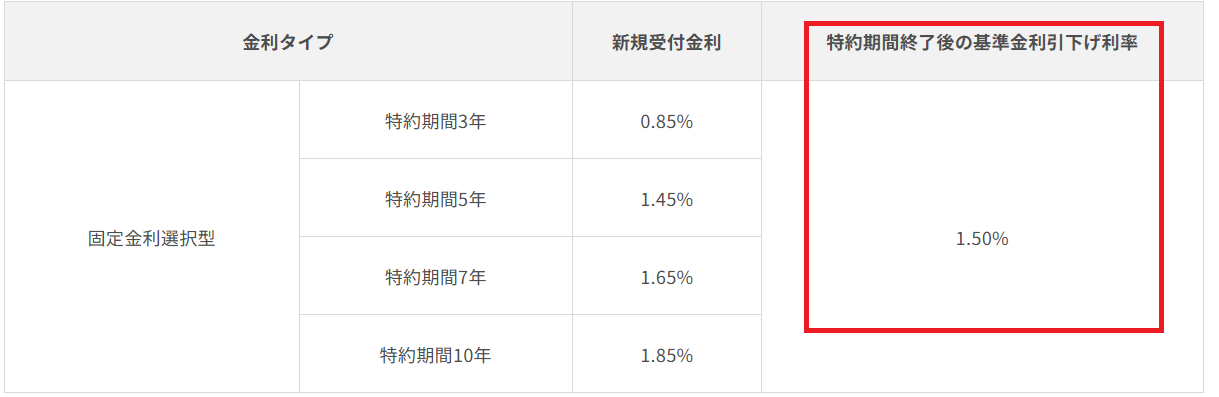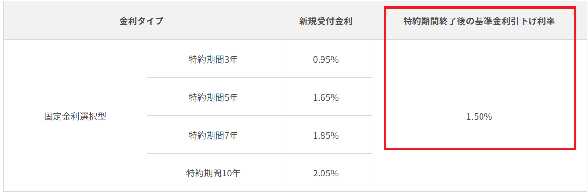固定期間が終了し、次の金利タイプを決める時に用いられるのは、上の図の赤枠で囲った『店頭基準金利から年マイナス1.50%』というものになります。