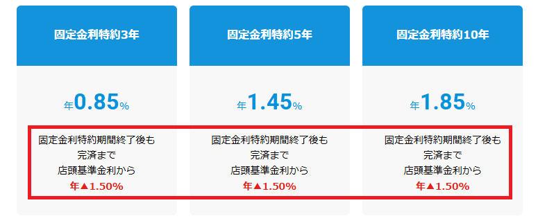 北洋銀行、北海道銀行ともに【1.2.固定金利期間選択型】で説明した通り『3年固定:0.85%』『5年固定:1.45%』『10年固定:1.85%』となっています。