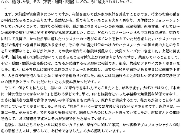 単に、FPと相談者といった事務的で無機質な関係ではなく、まさに相談者の立場で家づくりの楽しみや不安を共有し、家が完成するまで私たちが迷うことなく道を示していってくれました。