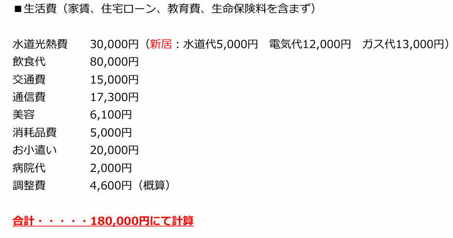 生活費は定義が曖昧なので、当事務所では『家賃、住宅ローン、保険料、教育費』は含まずに、毎月かかるお金のことを生活費と定義しています。