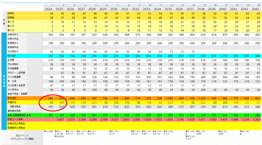 具体的な数値で表しているキャッシュフロー表を見ると、子どもの教育費がかさむタイミングは資産が減ってしまうものの、なんとか資産がマイナスになることは避けられています。