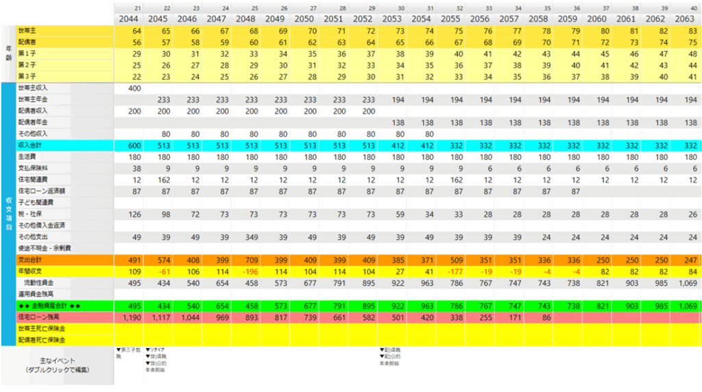 上の図は、資産がどのように推移していくかのグラフですが、生涯を通して一度も資産がマイナスにはなっていません。